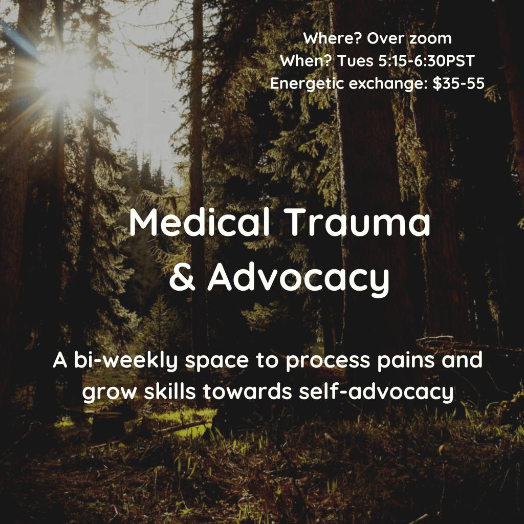 I will facilitate a bi-weekly process space where folks from all walks of life, diagnoses (or lack of) – folks at any stage in their journey – can meet to share their stories, (such as medical neglect, dismissiveness, gaslighting, not receiving any or receiving insufficient care, having pain or symptoms minimized, exhaustion, exasperation, burnout and beyond) offer support, and be supported. ♡